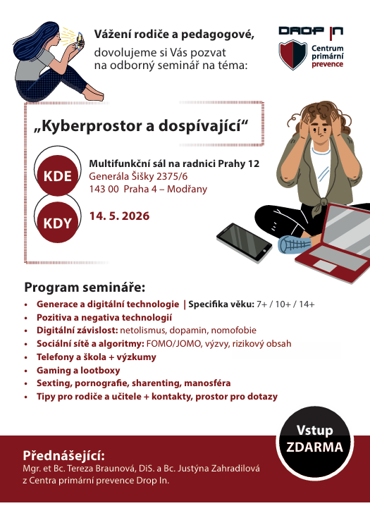 MČ Prahy 12 zve na seminář pro rodiče, který se uskuteční ve čtvrtek 14. května od 17:30 v multifunkčním sále Radnice MČ Praha 12 na téma „kyberprostor a dospívající“ – viz obrázek.